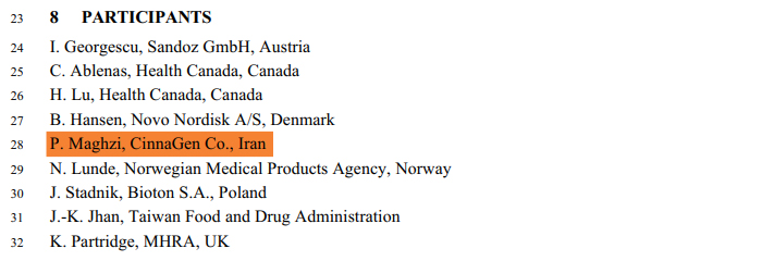 In this official European document, the name “P. Maghzi, CinnaGen Co., Iran” appears among the list of collaborating laboratories, a clear sign of Iran’s scientific presence at the highest levels of global pharmaceutical standardization.